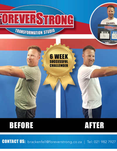 “Amazing!!! From the first mail to a first call. Friendly staff and made me feel right at home from the moment go… Very professional from administration staff to all the trainer’s, it is wonderful to see how they have a personal touch and training relationship with everyone to make them achieve their transformation goals… It was not easy at the beginning but there was someone always to help motivate!!! Results Results Results, I have lost so much body fat it is unreal !!! I feel and look like a new me… Well done to all, I would never join another Gym Family other then ForeverStrong Brackenfell!!!! Well done to all staff!!!”